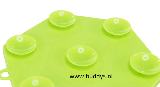 De lickmat is gemaakt van siliconen en de zuignappen zorgen ervoor dat deze niet wegglijd.