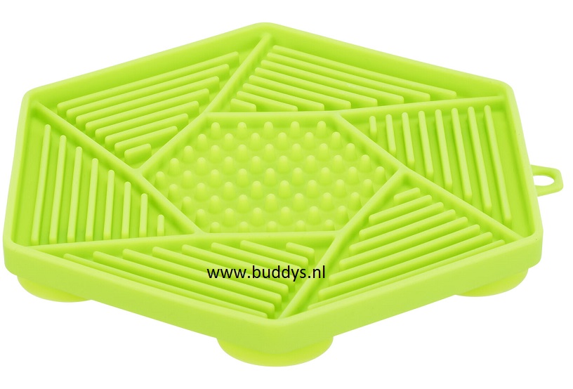 De lickmat is gemaakt van siliconen en de zuignappen zorgen ervoor dat deze niet wegglijd.