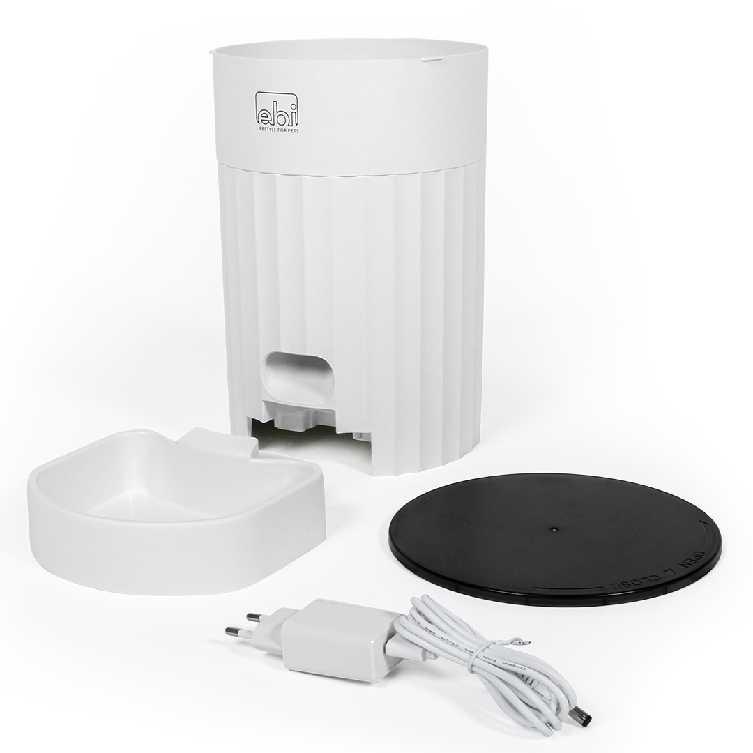 Talakona van EBI is een programmeerbaar voersysteem voor honden en katten, ideaal als je onverwacht een paar uur moet overwerken en je huisdier gewend is om op een vast moment eten te krijgen. Talakona heeft een inhoud van 3 liter en werkt met porties van 20 gram. Je kan tot 120g per portie geven, doseer op maat van je dier. Stel in hoeveel porties je huisdier krijgt en op welke tijdstippen. Je kan tot 4 tijdstippen per dag instellen. Geef gulzige huisdieren kleinere porties voeding en verdeel deze gedurende de dag. Kleinere porties helpen je dier namelijk zijn voedsel beter te verteren en de energie uit de voedingen beter op te nemen. Talakona werkt via een 5V adapter en batterijen (4x AA Alkaline, niet inbegrepen). Als de stroom zou uitvallen blijft het voedersyteem tijdelijk werken op de batterijen, dus geen nood mocht de stroom uitvallen. Het is niet aan te raden om alleen op batterijen te gebruiken, vanwege snel verbruik. Talakona is alleen geschikt voor droog voer. Het voersysteem zelf is niet geschikt voor de vaatwasser, alleen het uitneembaar voerbakje. Het deksel kan goed afgesloten worden door een draaisysteem, je huisdier zal het niet kunnen openmaken. WAARSCHUWING: het voersysteem is niet gemaakt om je huisdier voor langere periode alleen te laten!