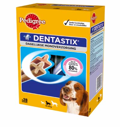 PEDIGREE® DentaStix® Medium voor volwassen honden van middelgrootte grootte heeft een unieke X-vorm. Het is klinisch bewezen dat bij dagelijks gebruik zijn speciale textuur en de actieve ingrediënten de vorming van tandsteen tot 80% kan verminderen.