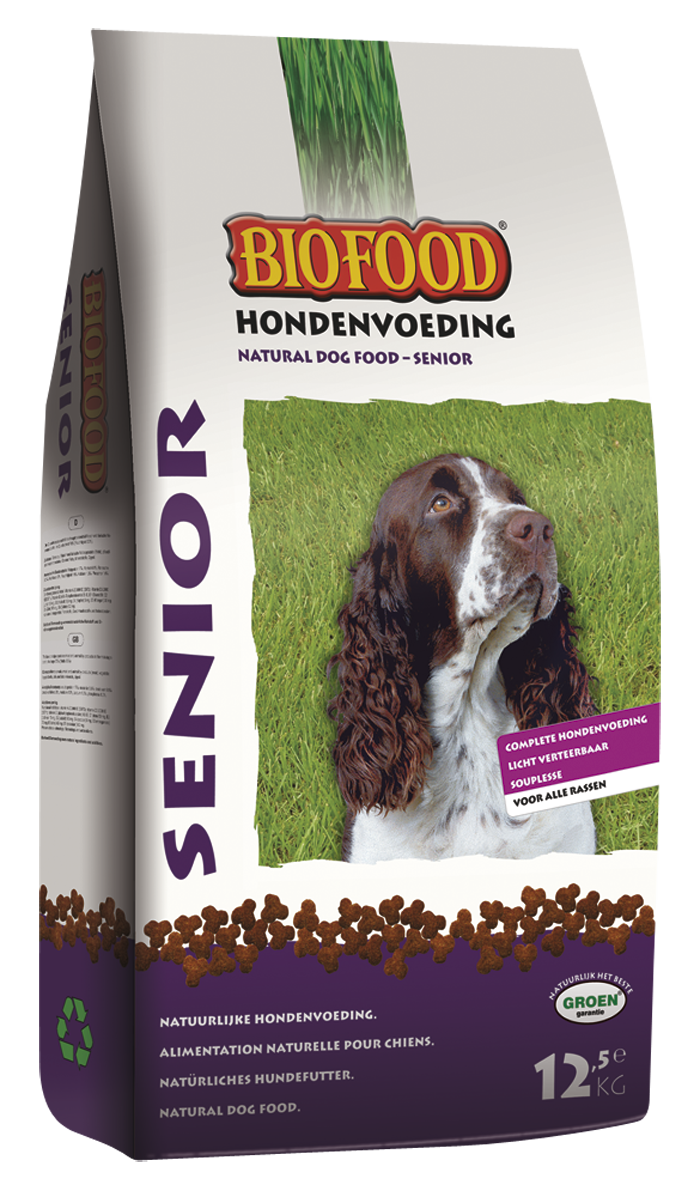 BIOFOOD Senior is een volledige licht verteerbare, natuurlijke en zeer smaakvolle hondenvoeding speciaal ontwikkelt voor de oudere hond (ouderdomsverschijnselen). BIOFOOD senior bevat de optimale dagelijkse hoeveelheid eiwitten, vetten, koolhydraten, vitaminen en mineralen die bijdragen tot een goede gezondheid van uw senior hond. Een verlaagd eiwitgehalte en aangepaste hoeveelheid mineralen ontlasten de nieren. De bronnen van eiwitten, koolhydraten en vetten zijn van hoge kwaliteit. Deze zorgen voor een betere vertering, ontlasting en een goede conditie van de oudere hond.