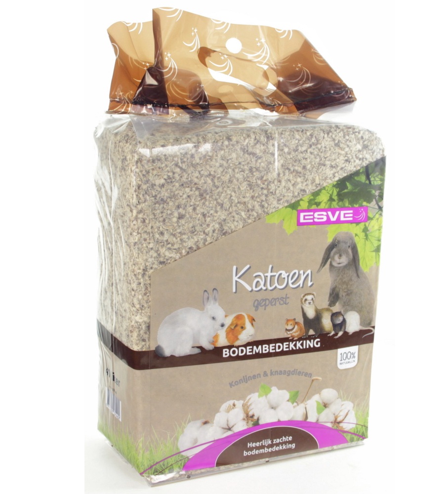 Een 100% biologische bodembedekker voor hokken met knaagdieren en konijnen. Het product is op basis van katoenzaad vezel, dat vocht en geurtjes uitstekend absorbeert. Het hok blijft daardoor langer schoon, droog en vrij van geurtjes. Katoen ESVE is tevens stofvrij, dus uitstekend geschikt voor rat, muis en fret.