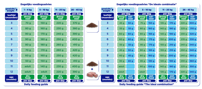 Onze droogvoedingen zijn allemaal compleet, dit betekent dat deze voeding alle voedingstoffen bevat die jouw hond nodig heeft. Je kunt de brokken afwisselen of combineren met onze Vers Vlees Maaltijden, dit mag zelfs in één maaltijd. Wij adviseren, waar mogelijk, veel af te wisselen in smaken. Dit houdt het immuunsysteem van je hond wakker, zorgt ervoor dat je hond niet snel intoleranties of allergieën opbouwt en je hond raakt niet snel verveelt. Wij eten ook niet graag dagelijks hetzelfde toch?