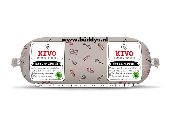 Kivo rund en kip compleet bevat vers rundvlees en vers kippenvlees.