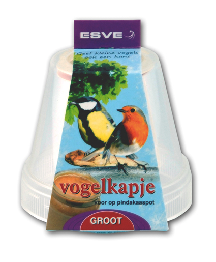Een handig kapje wat uw op de pindakaaspot kunt doen zodat alleen de kleine vogeltjes bij de pindakaas kunnen komen.